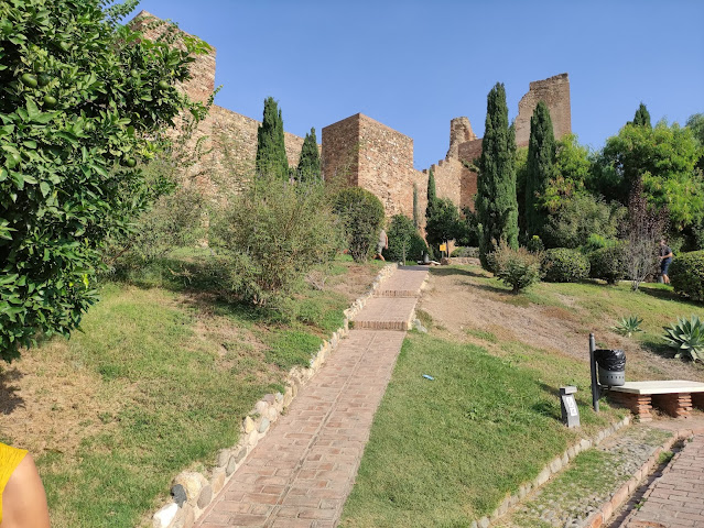 contrariamente a quanto si pensa vedendo la mappa che metto qui di seguito che rappresenta l' Alcazaba ed il castello di Gibralfaro uniti da una lunga muraglia , per andare al castello bisogna uscire dall'alcazaba ed incamminarsi sul sentiero che porta alla sommità del castello seguendo il percorso che vedremo